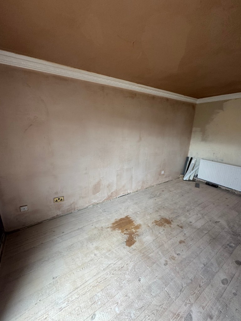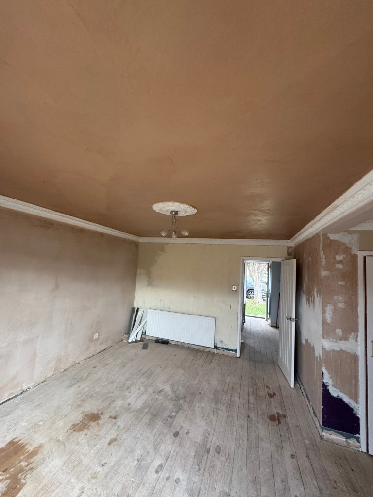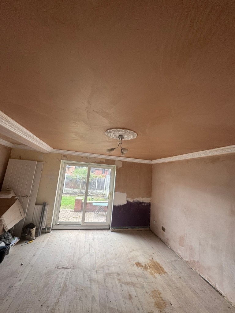 The customer wanted rid of all the artexed ceilings, and a couple of walls. including blocking up the old fireplace, before they moved into their new house
