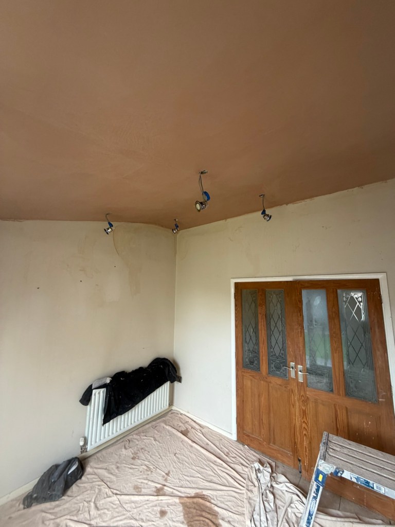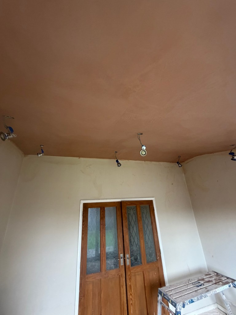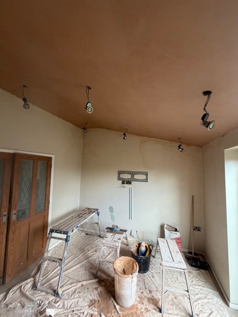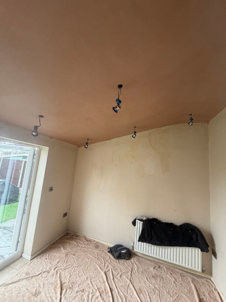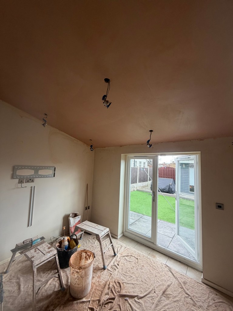 Skimming a very high sloped extension ceiling after roof repairs at Rawmarsh